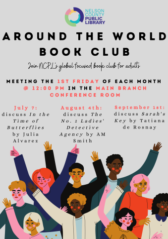 Our Around the World Book Club, led by Kimberly Burton, meets the 1st Friday of each month in the Main Branch Conference Room at 12:00 pm to discuss books by authors from all around the world. At our July 7 meeting, we'll discuss In the Time of the Butterflies by Dominican author Julia Alvarez (also available on Hoopla & Libby).