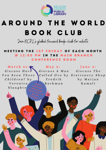 Our Around the World Book Club, led by Kimberly Burton, typically meets the 1st Friday of each month in the Main Branch Conference Room at 12:00 pm to discuss books by authors from all around the world. Due to Good Friday, our April meeting will be pushed to Friday, March 31st, at 12 pm. We'll discuss Have You Seen These Children? by Filipino author Veronica Slaughter (also available on Hoopla).