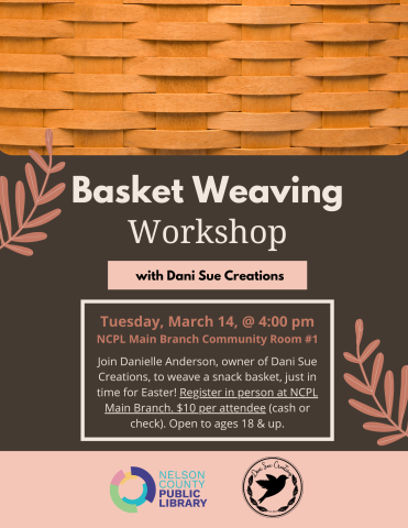 Join Danielle Anderson, owner of Dani Sue Creations, to weave a snack basket, just in time for Easter! Register IN PERSON at NCPL Main Branch. $10 per attendee (cash or check). Open to ages 18 & up.