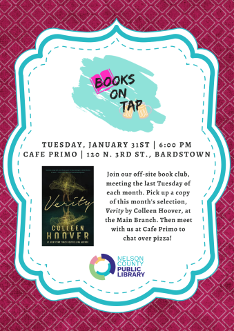 Join us each month for our off site book club, Books on Tap! Meet at 6 pm on Tuesday, January 31st, at Cafe Primo to discuss our latest selection, Verity by Colleen Hoover. Copies are available at the Main Branch.