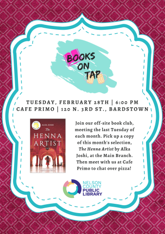 Join us each month for our off site book club, Books on Tap! Meet at 6 pm on Tuesday, February 28th, at Cafe Primo to discuss our latest selection, The Henna Artist by Alka Joshi. Copies are available at the Main Branch and on Hoopla and Libby.