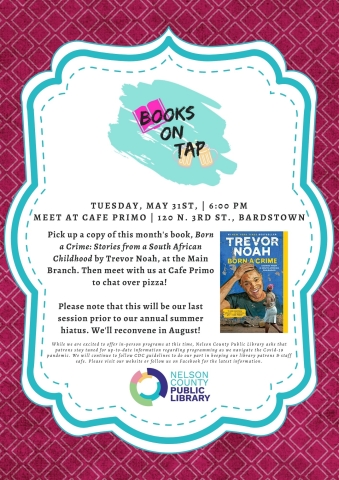 Join us each month for our off site book club, Books on Tap! Meet at 6 pm on Tuesday, 5/31, at Cafe Primo to discuss our latest selection, Born a Crime: Stories from a South African Childhood by Trevor Noah. Copies are available at the Main Branch. Please note that this will be our last meeting until August as the group takes a summer hiatus.