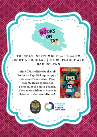 Books on Tap, our off site group led by Kimberly Burton, meets the last Tuesday of each month. Join us on September 24th at Scout & Scholar Brewing Co. (112 W. Flaget St., Bardstown) for a discussion of the historical fiction pick River Sing Me Home by Eleanor Shearer (also available on Libby).