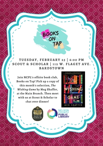 Books on Tap, our off-site group led by Kimberly Burton, meets the last Tuesday of each month at Scout & Scholar Brewing Co. (112 W. Flaget St., Bardstown). Please join us for our next meeting on February 25th when we'll discuss the fantasy pick The Wishing Game by Meg Shaffer (also available on Libby).
