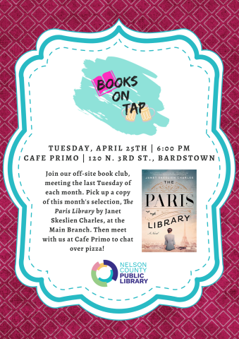 Books on Tap, our off site group led by Kimberly Burton, meets monthly at Cafe Primo for books, brews, and pizza. A variety of books are read, including thrillers, historical fiction, contemporary fiction, memoirs, and more. Join us April 25th for a discussion of the historical fiction selection The Paris Library by Janey Skeslien Charles (also available on Libby).