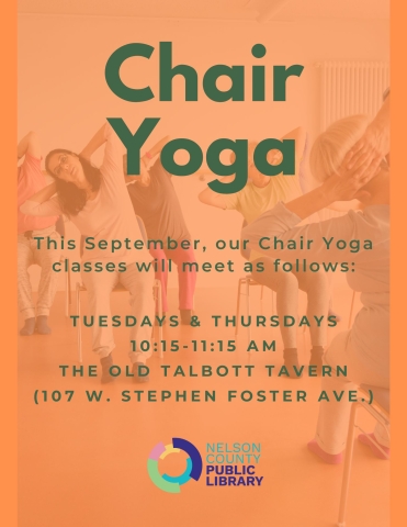 Chair Yoga will continue to meet off-site this September! Our weekly Chair Yoga sessions with Traci will meet at The Old Talbott Tavern (107 W. Stephen Foster Ave., Bardstown) through the end of September. We'll gather at 10:15 am on Tuesdays and Thursdays throughout the month. Don't miss out! Open to ages 18 and up. No registration required.