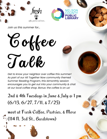Get to know your neighbor over coffee this summer! As part of our All Together Now community themed Summer Reading Program, this bimonthly session encourages you to get out into your community & chat at our local coffee shop. We'll meet the 2nd & 4th Tuesdays in June & July (6/13, 6/27, 7/11, & 7/25) at 1:00 pm at Fresh Coffee, Pastries, & More (114 N. 3rd St., Bardstown). Bonus: the coffee is on us! Open to ages 18 & up.