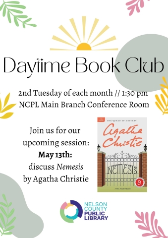 Daytime Book Club, led by Sandy LaFollette & Barbara Lammers, meets the 2nd Tuesday of each month at 1:3o pm in the Conference Room. The group discusses a wide range of titles, from thrillers to contemporary fiction to memoirs. The focus of the May 13th meeting will be Agatha Christie's classic mystery Nemesis (also available on hoopla and Libby).