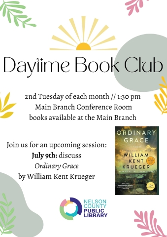Daytime Book Club, led by Sandy LaFollette & Barbara Lammers, meets the 2nd Tuesday of each month at 1:3o pm in the Main Branch Conference Room. The group discusses a wide range of titles, from thrillers to contemporary fiction to memoirs. The focus of the July 9th meeting will be the fiction selection Ordinary Grace by William Kent Krueger (also available on hoopla and Libby).
