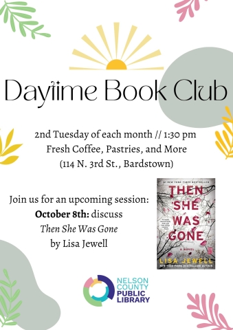 Daytime Book Club, led by Sandy LaFollette & Barbara Lammers, meets the 2nd Tuesday of each month at 1:3o pm. The group discusses a wide range of titles, from thrillers to contemporary fiction to memoirs. For our October 8th meeting, we'll meet at Fresh Coffee, Pastries, and More (114 N. 3rd St., Bardstown) to discuss the fiction selection Then She Was Gone by Lisa Jewell (also available on hoopla).
