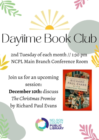 Daytime Book Club, led by Sandy LaFollette & Barbara Lammers, meets the 2nd Tuesday of each month at 1:3o pm in the Conference Room. The group discusses a wide range of titles, from thrillers to contemporary fiction to memoirs. The focus of the December 10th meeting will be the holiday fiction book The Christmas Promise by Richard Paul Evans (also available on hoopla and Libby).