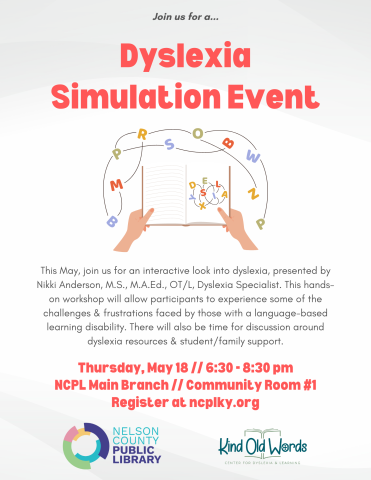 This May, join us for an interactive look into dyslexia, presented by Nikki Anderson, M.S., M.A.Ed., OT/L, Dyslexia Specialist. Meeting Thursday, May 18, from 6:30-8:30 pm, this is a hands-on workshop will allow participants to experience some of the challenges and frustrations faced by people with a language-based learning disability. This simulation will provide a lively, thought-provoking activity for teachers, parents, or anyone interested in better understanding the lives of individuals with dyslexia. Participants will rotate among learning stations that simulate language-related tasks that may be encountered in the classroom and workplace. There will also be time for discussion around dyslexia resources and student/family support. Registration required.