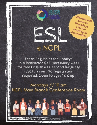インストラクターのゲイル ハートによる、初心者から中級者までのあらゆるレベルを対象とした無料の第二言語としての英語 (ESL) クラスに毎週参加してください。セッションは木曜日午前10時から本支店会議室で開催されます。登録は必要ありません。 18 歳以上が対象です。