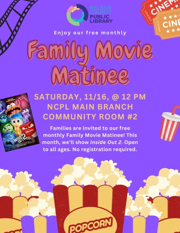 Families are invited to our free monthly Family Movie Matinee! On Saturday, November 16, at 12:00 PM, in NCPL Main Branch Community Room #2, we'll show Inside Out 2. Open to all ages. No registration required.