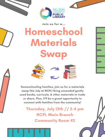 Homeschooling families, join us for a materials swap this July at NCPL! Bring unneeded gently used books, curricula, & other materials to trade or share. Plus, it'll be a great opportunity to connect with families from the community!