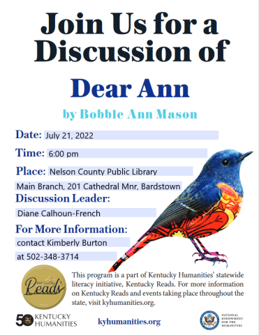 Join us for a discussion of Dear Ann by Kentucky author Bobbie Ann Mason as part of Kentucky Humanities statewide literacy initiative, Kentucky Reads. Stop by the Main Branch prior to the session to pick up a copy of the book to read for the discussion, led by Diane Calhoun-French.