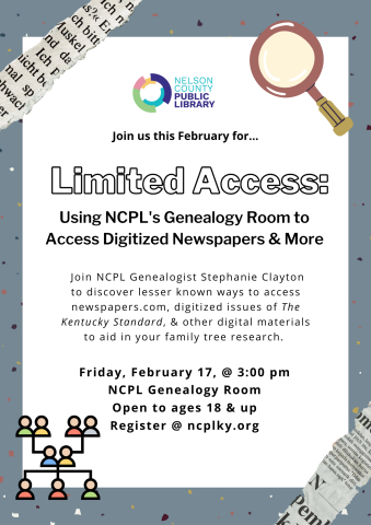 Join NCPL Genealogist Stephanie Clayton to discover lesser known ways to access newspapers.com, digitized issues of The Kentucky Standard, & other digital materials to aid in your family tree research. Join us Friday, February 17, @ 3:00 pm, in the Main Branch Genealogy Room. Open to ages 18 & up. Registration required.