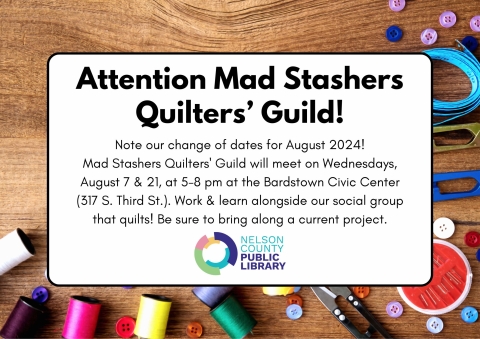 Attention Mad Stashers Quilters’ Guild! Note our change of dates for August 2024! Mad Stashers Quilters' Guild will meet on Wednesdays, August 7 & 21, at 5-8 pm at the Bardstown Civic Center (317 S. Third St.). Work & learn alongside our social group that quilts! Be sure to bring along a current project.