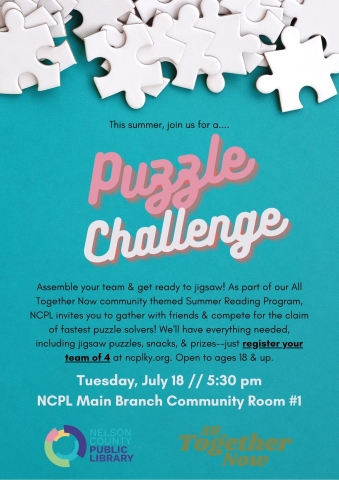 As part of our All Together Now community themed Summer Reading Program, NCPL invites you to gather with friends & compete for the claim of fastest puzzle solvers! We'll have everything needed, including jigsaw puzzles, snacks, & prizes. Just register your team of 4 for this event, to be held Tuesday, July 18, at 5:30 pm at NCPL Main Branch Community Room #1. Open to ages 18 & up. Don't miss this evening of old fashioned fun!