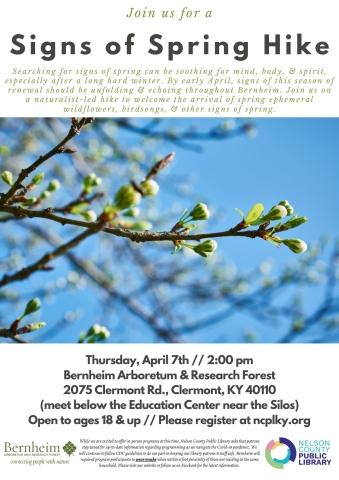 Searching for signs of spring can be soothing for mind, body, & spirit, especially after a long hard winter. By early April, signs of this season of renewal should be unfolding & echoing throughout Bernheim. Join us on a naturalist-led hike to welcome the arrival of spring ephemeral wildflowers, birdsongs, and other signs of spring. Registration required. Open to ages 18 and up. The session will be held at Bernheim Arboretum & Research Forest (2075 Clermont Rd., Clermont, KY 40110--meet below the Education Center near the Silos).