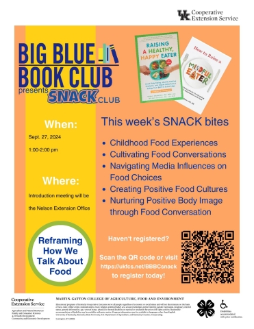 Calling all parents and caregivers of little ones! Join us for Big Blue Book Club's Snack Club this September at the Nelson County Extension Office. This upcoming event, scheduled for Friday, September 27, at 1:00 pm, is a version of a book club that’s a little different than a traditional book club. Reading is not required! Podcast episodes and YouTube videos summarize books with information on raising healthy eaters that you can watch or listen to on your own time. Meet with us to discuss some of these selections. Please register at https://ukfcs.net/BBBCsnack and call Danielle Hagler at 502-348-9204 if you'd like to attend the in-person session.