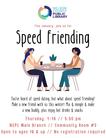You’ve heard of speed dating, but what about speed friending? Make a new friend with us this winter! Mix and mingle and make a new buddy, plus enjoy hot drinks and snacks at our event, Thursday, January 16th, at 5:30 pm in NCPL Main Branch Community Room #2. Open to ages 18 & up. No registration required.