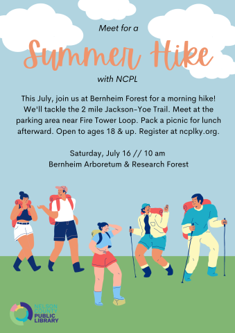 This July, join us at Bernheim Arboretum & Research Forest for a morning hike! We'll meet Saturday, July 16, at 10 am at the parking area near Fire Tower Loop to tackle the 2 mile Jackson-Yoe Trail. Pack a picnic for lunch afterward. Open to ages 18 & up. Register at ncplky.org.
