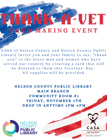 CASA of Nelson County and Nelson County Public Library invite you and your family to thank the brave men and women who have served our country by creating a card that will be donated to them this Veterans' Day. Join us in Main Branch Community Room #1 on Friday, November 4, 2022, any time between 2:00-4:00 pm. All supplies will be provided. No registration required.