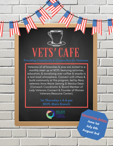Veterans of all branches & eras are invited to a monthly meet up at NCPL featuring activities, education, & socializing over coffee & snacks in a laid-back atmosphere. Connect with others & build community at this session, led by Navy veterans Anna Marie Janning & Monica Dean (Outreach Coordinator & Board Member of Lady Veterans Connect & Founder of Women Veterans Resource Center). Meet with us the 1st Thursday of each month at 4-6 pm, this month in the NCPL Main Branch Conference Room.