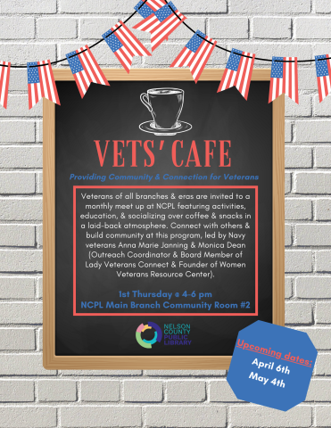 Veterans of all branches & eras are invited to a monthly meet up at NCPL featuring activities, education, & socializing over coffee & snacks in a laid-back atmosphere. Connect with others & build community at this session, led by Navy veterans Anna Marie Janning & Monica Dean (Outreach Coordinator & Board Member of Lady Veterans Connect & Founder of Women Veterans Resource Center). Meet with us the 1st Thursday of each month at 4-6 pm in NCPL Main Branch Community Room #2. At our April session, we'll feature a representative from Military Onesource.