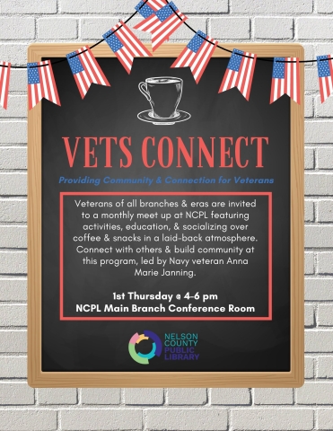 Veterans of all branches & eras are invited to a monthly meet up at NCPL featuring activities, education, & socializing over coffee & snacks in a laid-back atmosphere. Connect with others & build community at this session, led by Navy veteran Anna Marie Janning. Meet with us the 1st Thursday of each month at 4-6 pm in the NCPL Main Branch Conference Room.